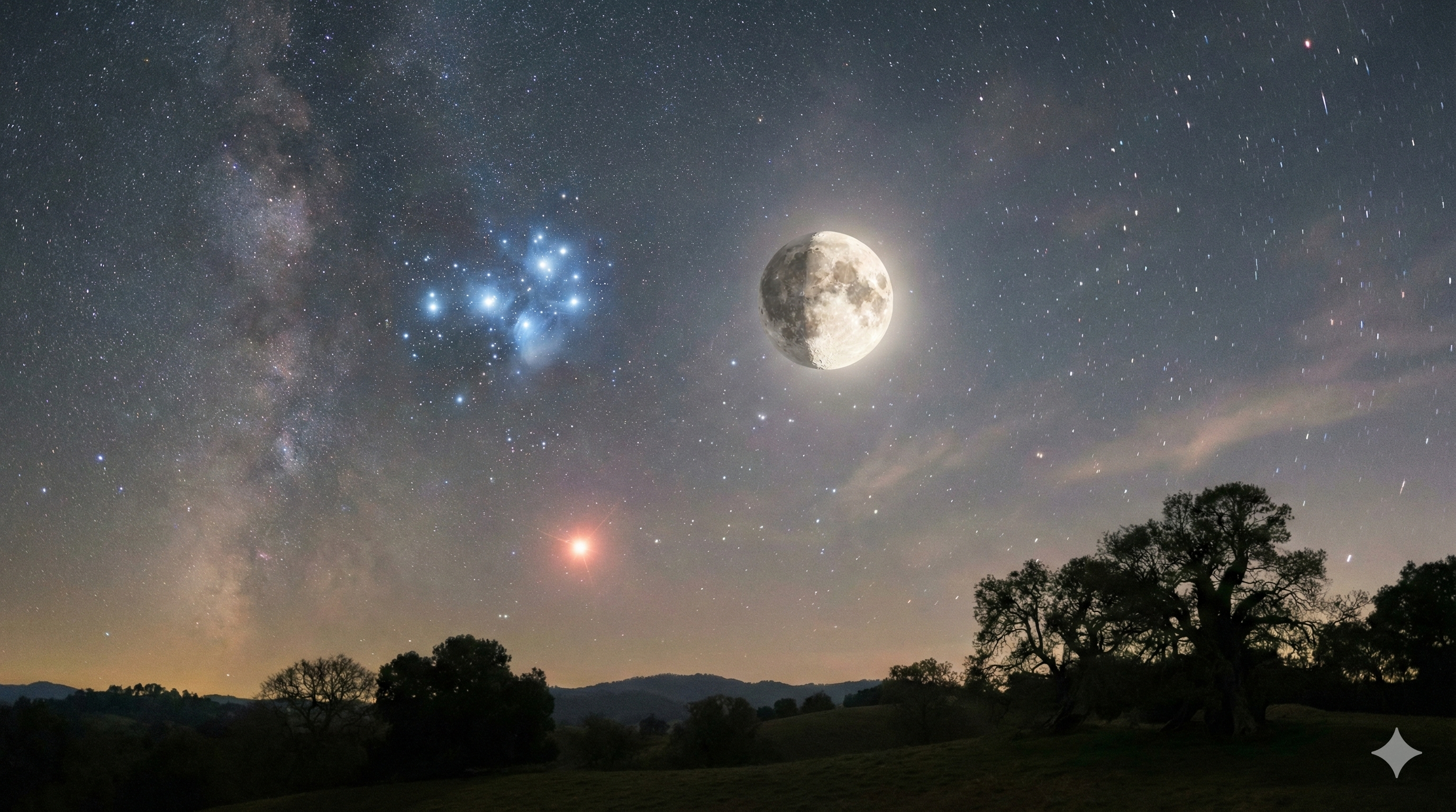 다가오는 화요일 밤, 하늘은 우리에게 잊지 못할 장면을 선사할 예정이에요. 바로 볼록한 달(gibbous moon)이 밤하늘의 보석 같은 플레이아데스 성단(Pleiades)과 어우러지는 모습이랍니다. 그리고 그 옆에는 황소자리의 붉은 눈, 알데바란(Aldebaran)이 고요히 빛나며 이 아름다운 풍경에 깊이를 더해줄 거예요. 마치 달이 별들의 무도회에 살며시 찾아든 듯한 그림 같은 모습이겠죠?