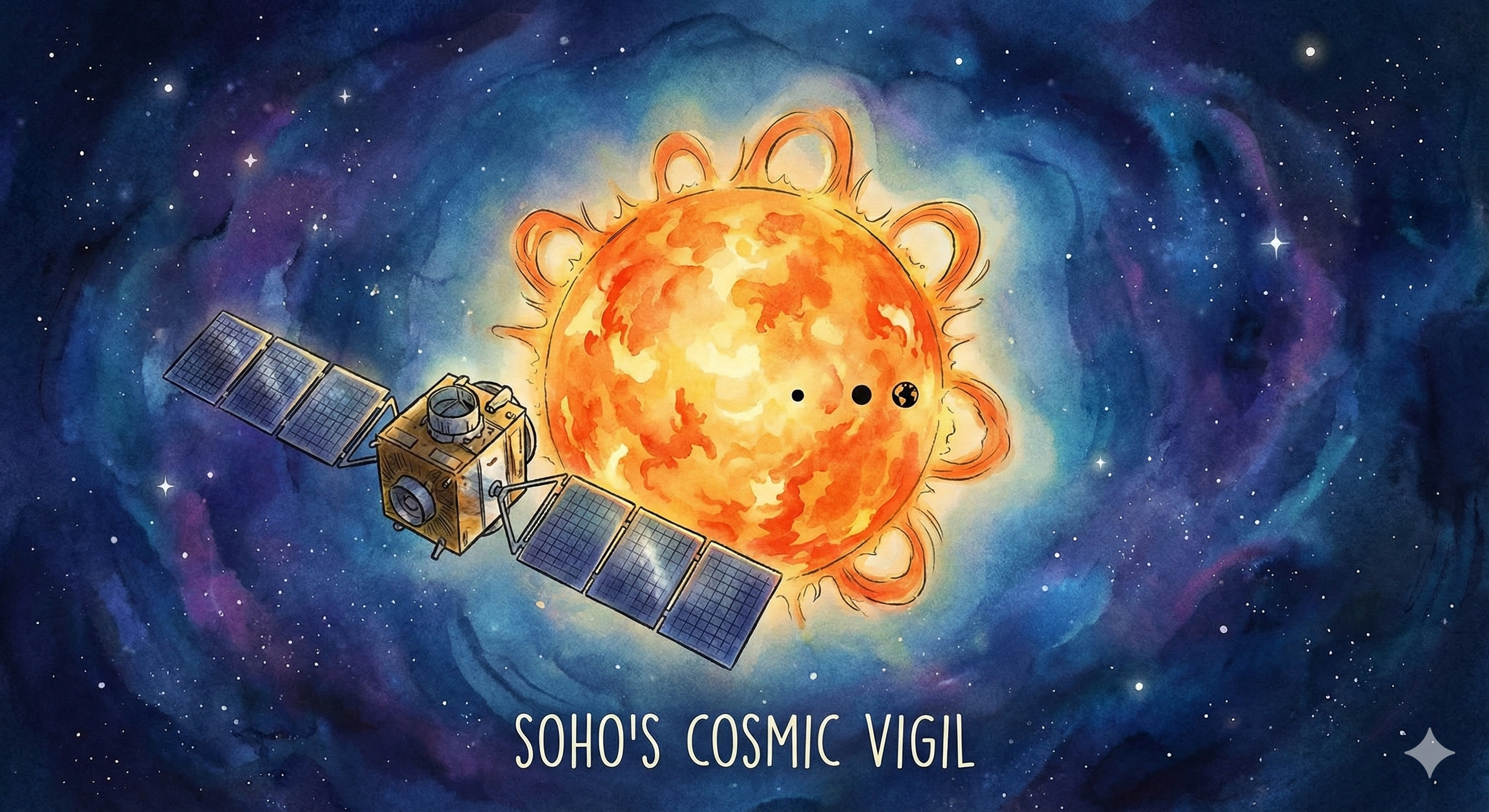 이번 장관을 포착한 주인공은 바로 태양-헬리오스 관측선(SOHO: Solar and Heliospheric Observatory)입니다. SOHO는 지구-태양 라그랑주 점에 위치하며 태양의 활동을 24시간 감시하는 우리의 소중한 우주 망원경이죠. 덕분에 우리는 늘 태양의 표면에서 일어나는 신비로운 변화들을 실시간으로 만나볼 수 있습니다. 그런데 오늘 아침, SOHO의 시선에 평소와는 다른, 아주 특별한 손님들이 나타났다고 해요. 바로 우리 태양계의 행성 세 개가 태양을 배경 삼아 '행성 퍼레이드'를 펼친 것이죠!