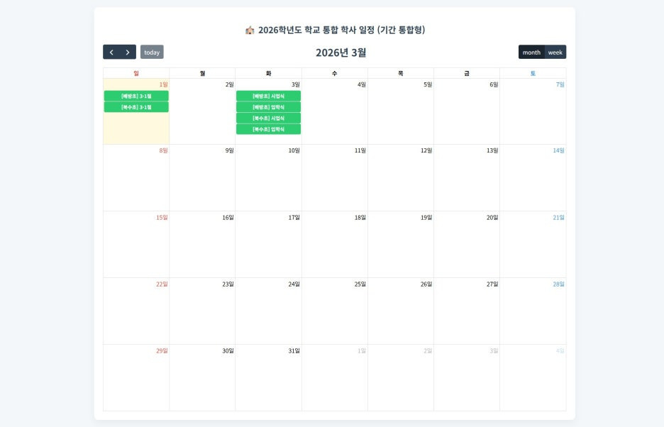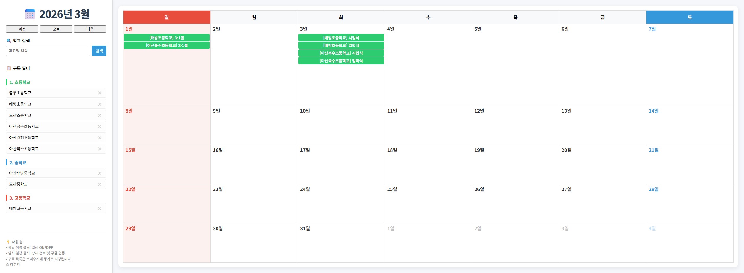 나이스 대국민 서비스에서 제공하는 open api로 원하는 학교의 학사일정을 볼 수 있게 만들어 봤습니다.